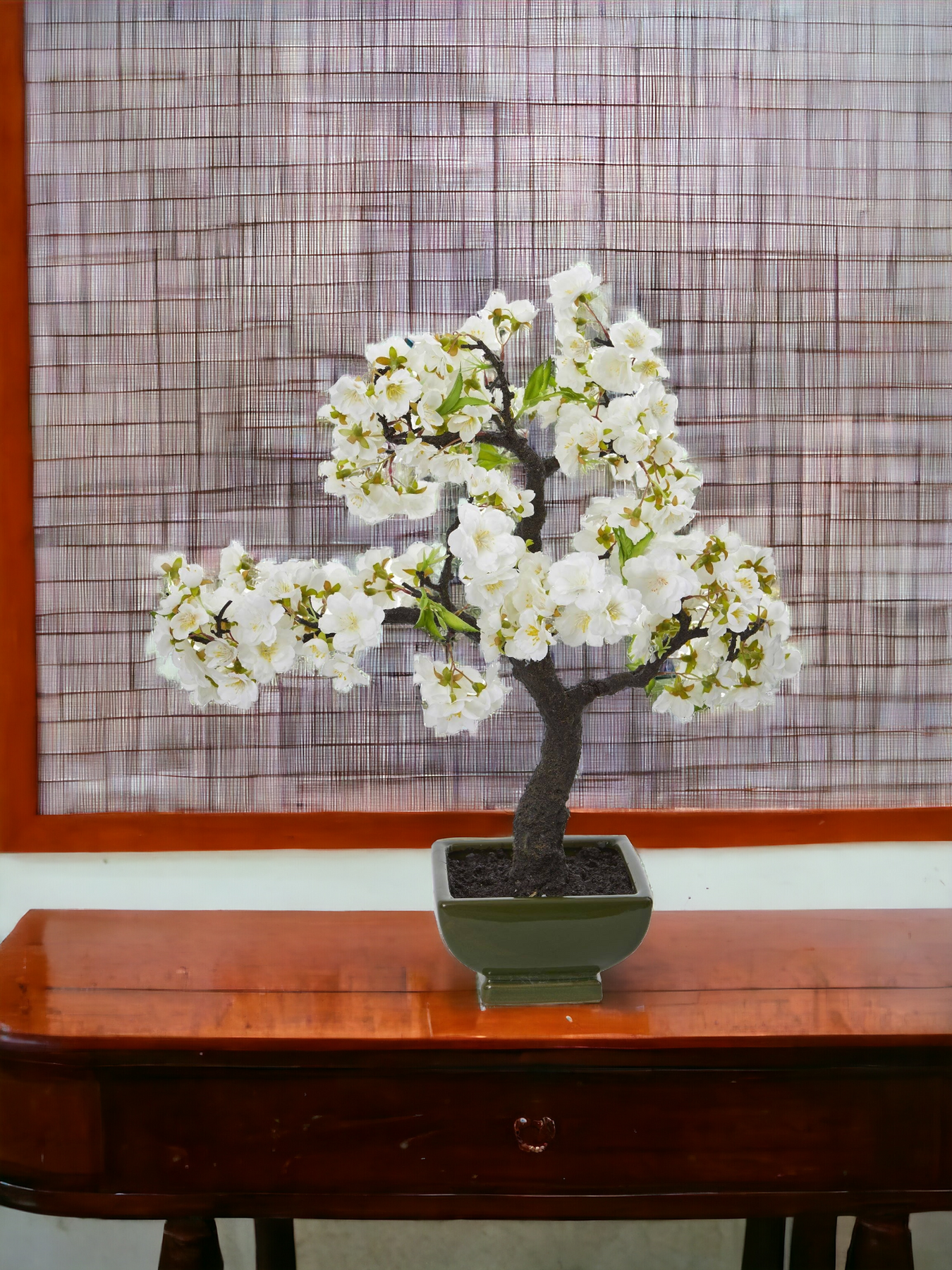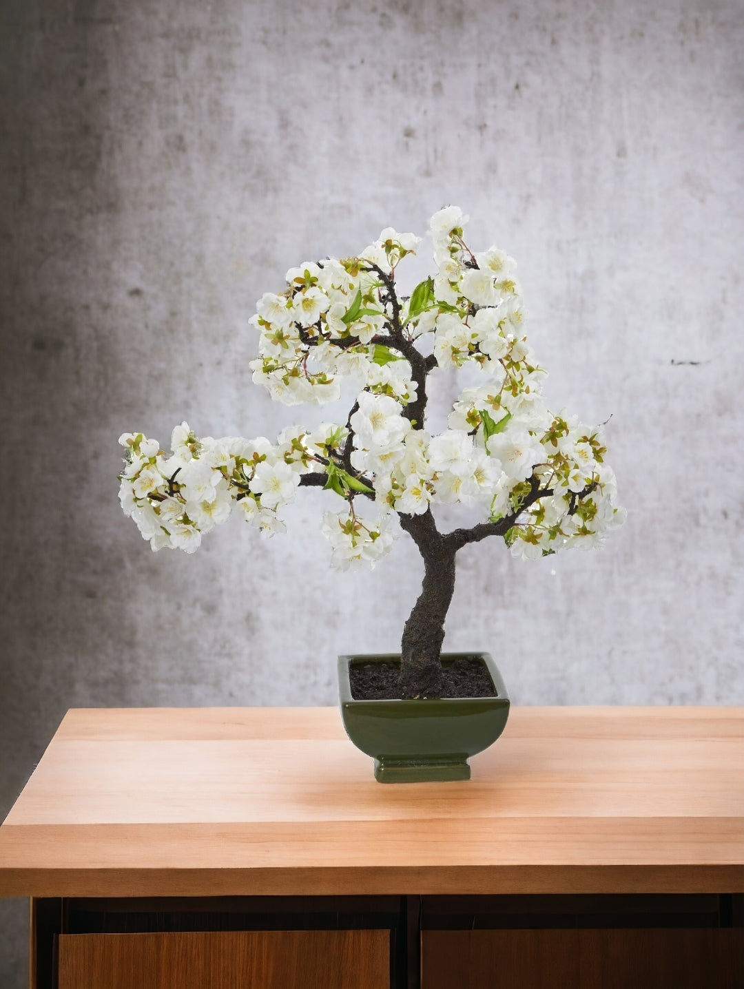 Known as the national flower of Japan, the cherry blossom tree features a strong stem with several lightly tinted white blooms on each branch. Standing at 20 inches tall, it makes a simple but dramatic centerpiece for a dining room table. Bring this beautiful artificial tree into your home to have spring indoors all year around.