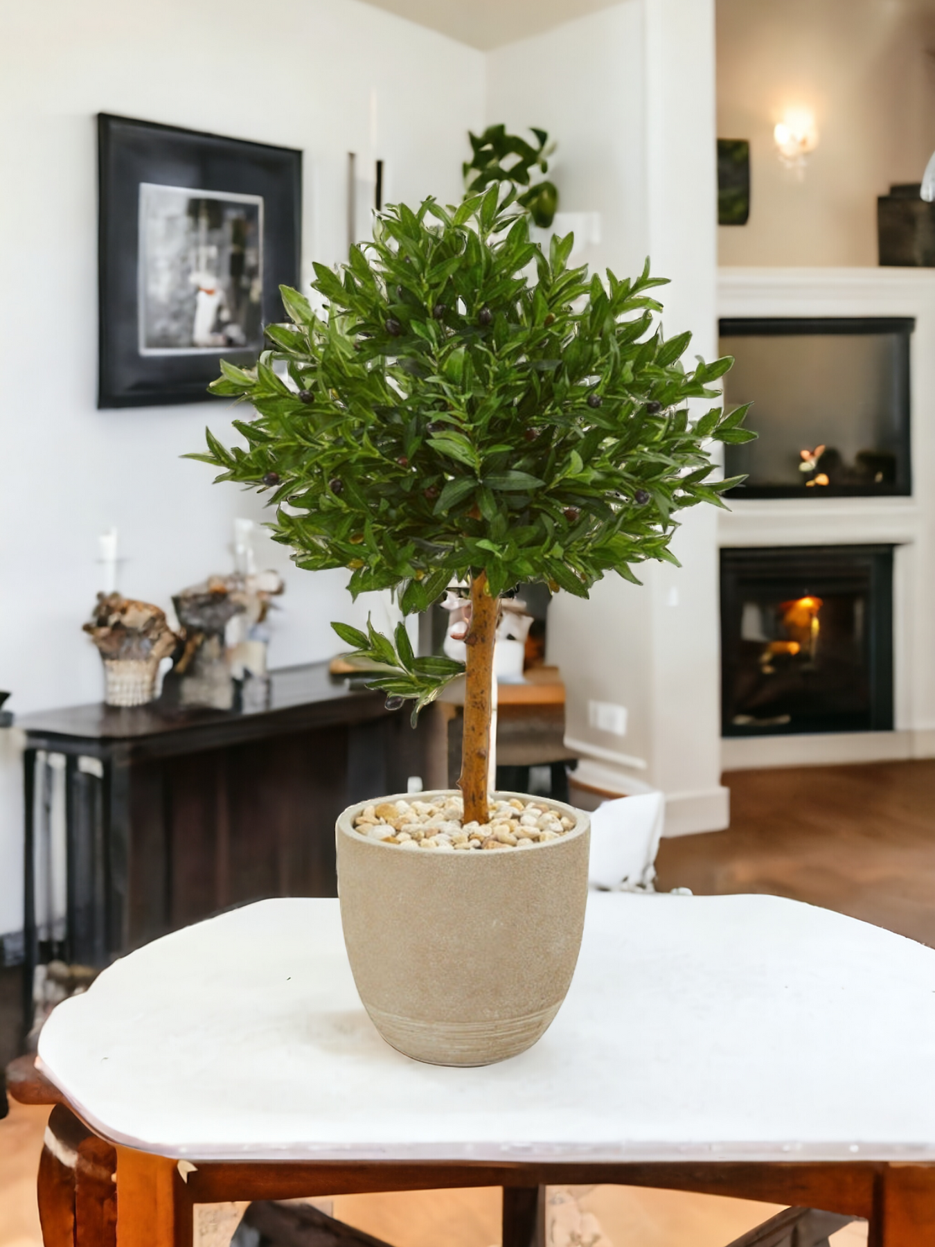 Enjoy the stunning realism of this 40” artificial outdoor safe olive topiary tree without the constant upkeep or watering. The highly-detailed lush green leaves resting atop the thin brown trunk will never outgrow its shape and will last for a long time. Standing within a simplistic sand stone planter with river rocks, set it beside your low bookcase for an eye-catching look. Or, get a pair of this to make a refreshing decor in your entryway or foyer.