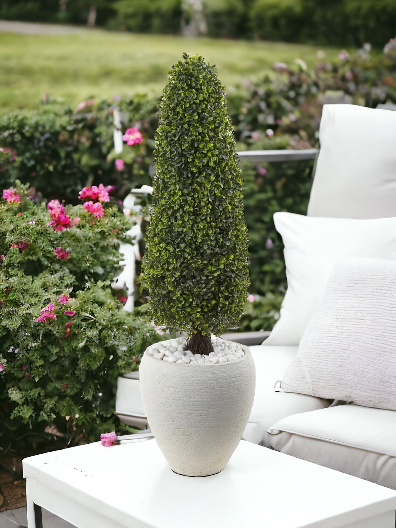 Tiny boxwood leaves come together to create a full bush. Crafted to round out the edges, this floor plant has a cylindrical shape that is pleasing to the eye. White river rocks sit on top of the planter to contrast with the dark brown stem. Comes in a textured, white vase. Perfect for indoor or outdoor use.