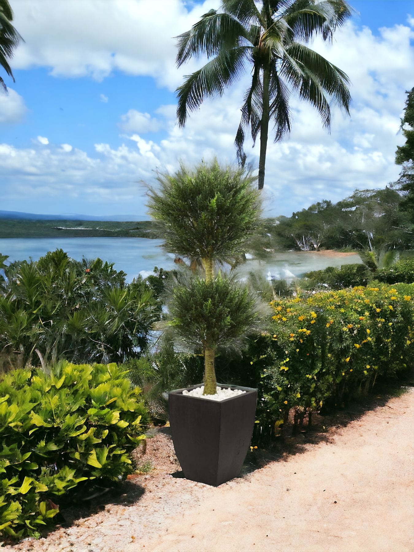 Enjoy the look of cypress pine without the mess. The 4.5’ Double Ball Cypress Topiary has needles that are crafted to mimic a true pine. It's textured, tan branches are rooted in white stones for a stark contrast in color. Comes in a square, black planter with a matte finish