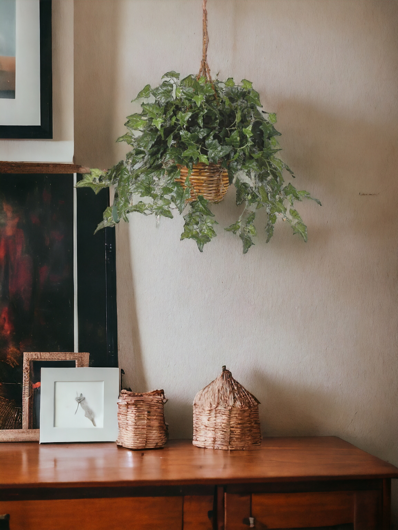 This amazing English Ivy Bush with hanging basket speaks for itself. This silk plant features 360 emerald green leaves meticulously shaped and bursting out of its beautiful wicker basket. It stands 17 inches tall, but grows to 26 inches when the hanging rope is extended. Certain to brighten up any space, this piece will add warmth and comfort. Color: Variegated Green